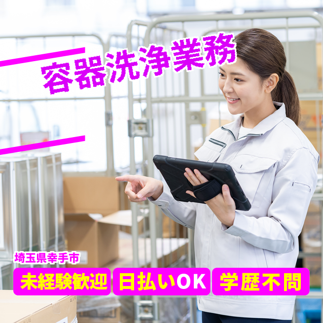 給与詳細 月収例 213,000円 日給例 10,800円 勤務地 埼玉県幸手市 仕事内容 【業務内容】容器洗浄オペレーターとして、製剤用原料を入れる容器の洗浄を担当します。