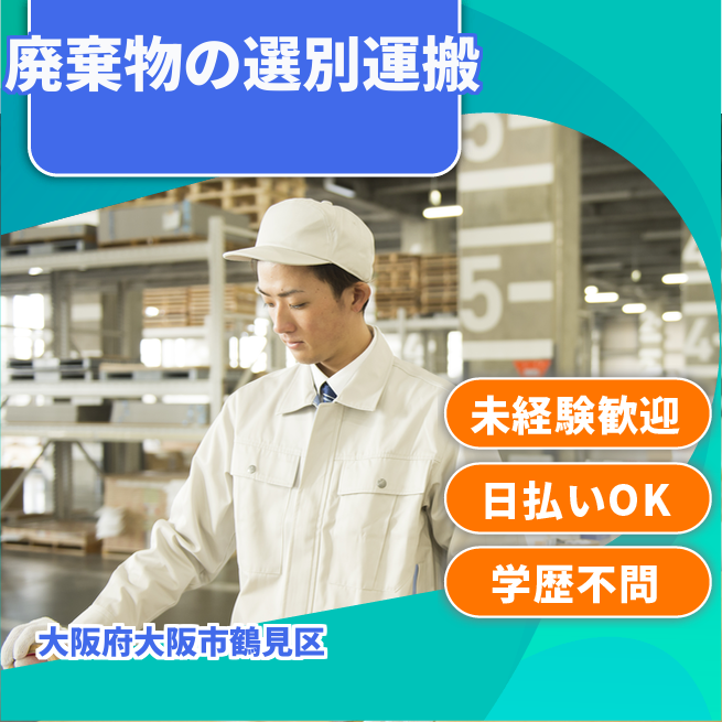 給与詳細 月収例 216,000円 日給例 10,800円 勤務地 大阪府大阪市鶴見区 仕事内容 【産業廃棄物の選別・運搬など(日勤)】