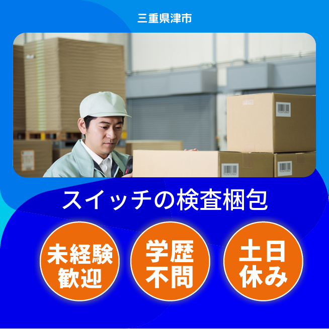 給与詳細 月収例 288,000円 日給例 10,800円 勤務地 三重県津市 仕事内容 【スイッチの検査・梱包業務(日勤)】