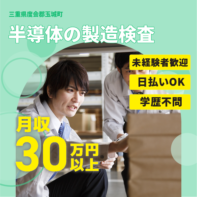 給与詳細 月収例 317,000円 日給例 10,800円 勤務地 三重県度会郡玉城町 仕事内容 【半導体素子の製造(2交替)】