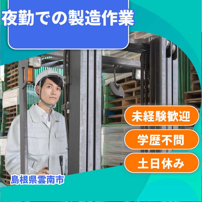 給与詳細 月収例 253,000円 日給例 11,040円 勤務地 島根県雲南市 仕事内容 【パワーコンディショナーの製造(夜勤)】