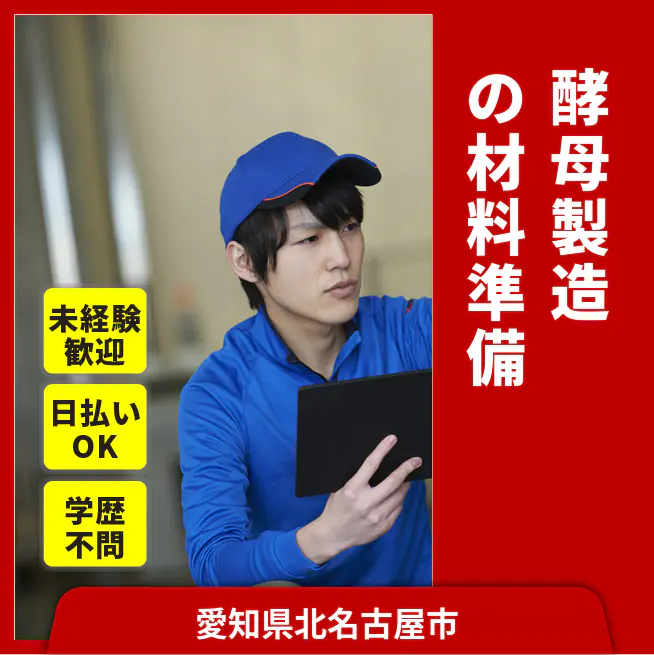 給与詳細 月収例 259,000円 日給例 11,200円 勤務地 愛知県北名古屋市 仕事内容 【業務内容】酵母製造の材料準備と補充作業