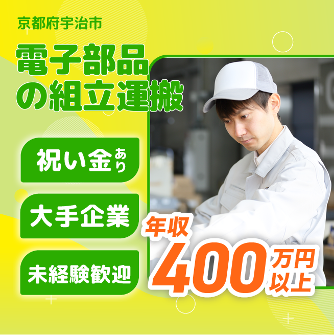 給与詳細 年収例 4,020,000円 月収例 335,000円 勤務地 京都府宇治市 仕事内容 【電子部品の組立・運搬など(2交替)】