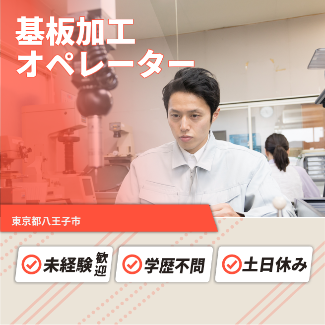 給与詳細 月収例 240,000円 日給例 11,200円 勤務地 東京都八王子市 仕事内容 【基板加工オペレーター(日勤)】