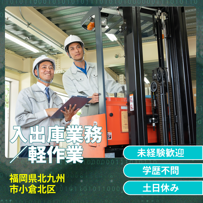 【月収例】21.6万円(20日勤務 ※残業なしの場合) 交通費 支給なし 応募の流れ 本ページ内<応募する>ボタンより、必要項目をご入力の上、ご応募ください。 勤務地 【勤務地】福岡県北九州市小倉北区西港町 勤務時間 【勤務地】【日中の勤務】