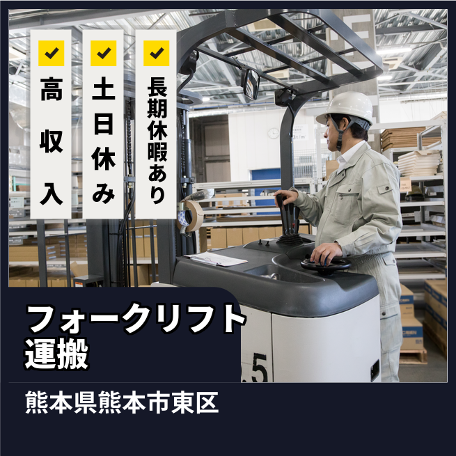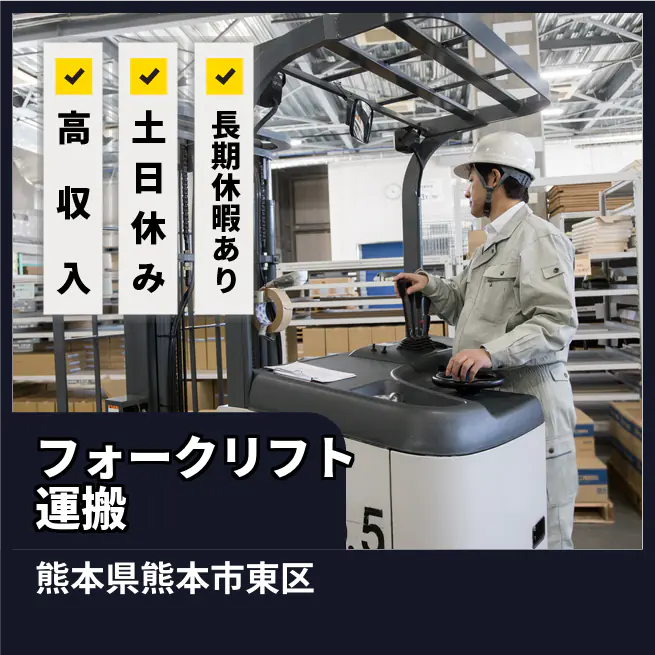 給与詳細 月収例 224,000円 日給例 11,200円 勤務地 熊本県熊本市東区 仕事内容 【業務内容】 フォークリフトを使用した日勤での運搬作業