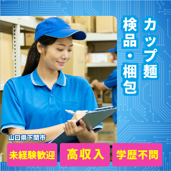 給与詳細 月収例 93,000円 日給例 11,200円 勤務地 山口県下関市 仕事内容 【業務内容】カップ麺製造における検品・梱包作業