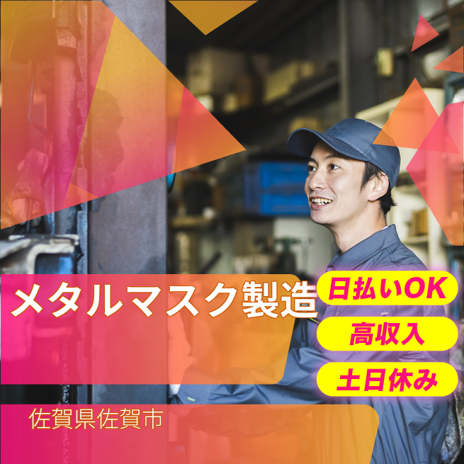 給与詳細 月収例 276,000円 日給例 11,200円 勤務地 佐賀県佐賀市 仕事内容 【業務内容】メタルマスクの製造と加工に関する業務を担当します