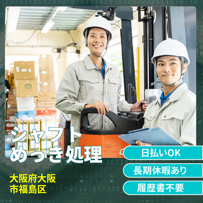 給与詳細 月収例 235,000円 日給例 11,200円 勤務地 大阪府大阪市福島区 仕事内容 【業務内容】 金属シャフトのめっき処理を行う作業