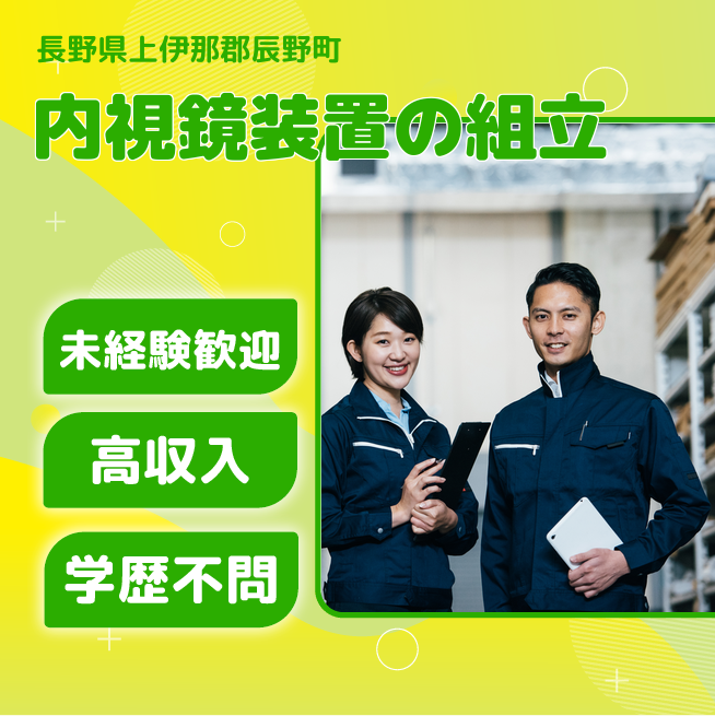 給与詳細 月収例 250,000円 日給例 11,600円 勤務地 長野県上伊那郡辰野町 仕事内容 【工業用内視鏡装置の組立(日勤)】