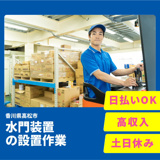 給与詳細 月収例 268,000円 日給例 11,600円 勤務地 香川県高松市 仕事内容 【装置の設置・取り扱い/要資格(日勤)】
