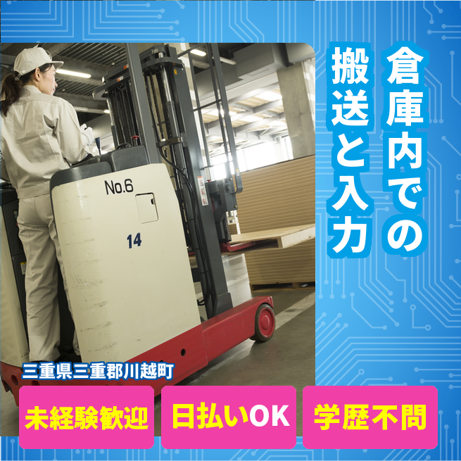 給与詳細 月収例 276,000円 日給例 12,000円 勤務地 三重県三重郡川越町 仕事内容 【倉庫内搬送業務(日勤)】
