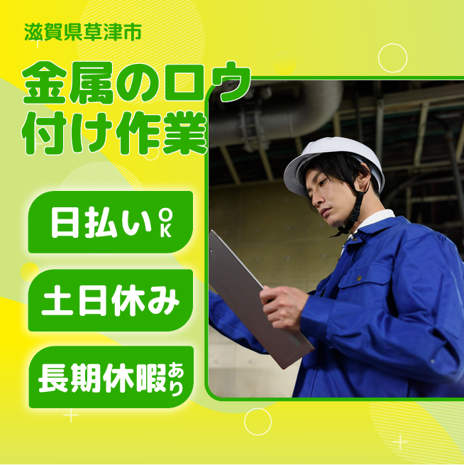 給与詳細 月収例 268,000円 日給例 12,000円 勤務地 滋賀県草津市 仕事内容 【金属のロウ付け、接合(日勤)】