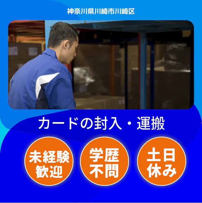 給与詳細 月収例 272,000円 日給例 12,000円 勤務地 神奈川県川崎市川崎区 仕事内容 【カードの封入・製造・運搬(日勤)】