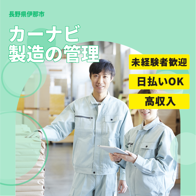給与詳細 月収例 232,000円 日給例 12,000円 勤務地 長野県伊那市 仕事内容 【カーナビ生産工程の管理など(日勤)】