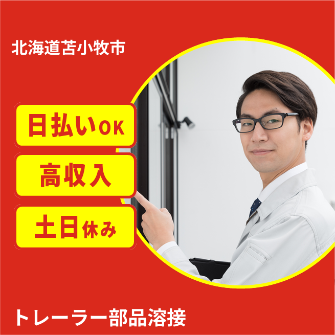 給与詳細 月収例 289,000円 日給例 12,000円 勤務地 北海道苫小牧市 仕事内容 【自動車用部品溶接(日勤)】