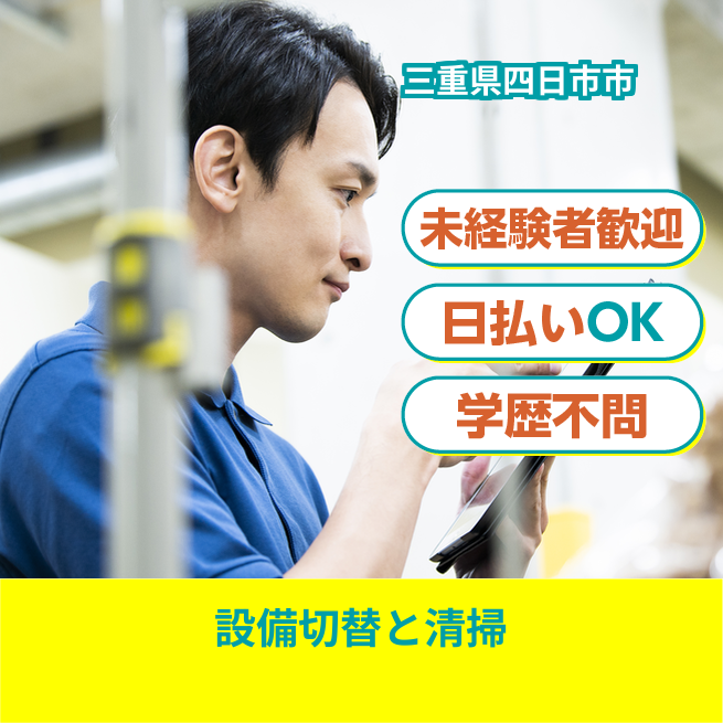 給与詳細 月収例 251,000円 日給例 12,000円 勤務地 三重県四日市市 仕事内容 【設備切替・清掃スタッフ(日勤)】
