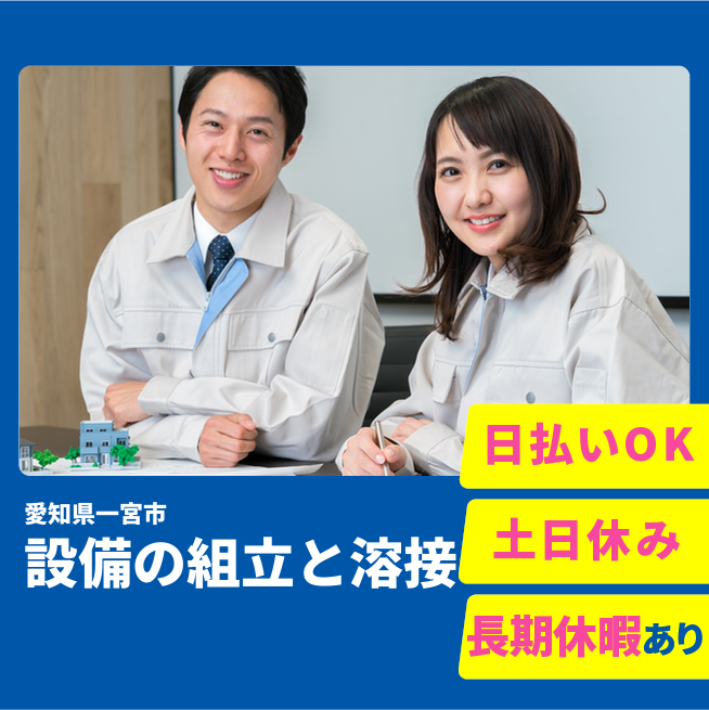 給与詳細 月収例 281,000円 日給例 12,400円 勤務地 愛知県一宮市 仕事内容 【工場用設備の組立・溶接(日勤)】