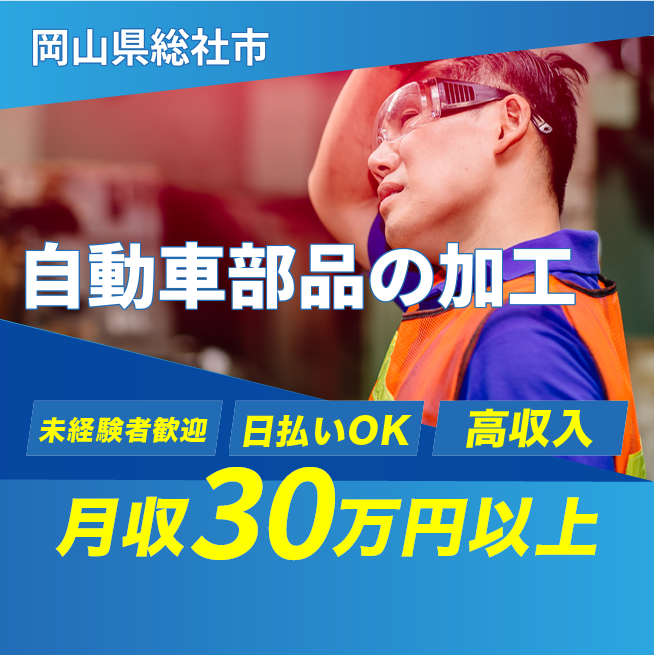 給与詳細 月収例 322,000円 日給例 12,400円 勤務地 岡山県総社市 仕事内容 【部品加工業務(2交替)】