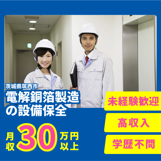 給与詳細 月収例 330,000円 日給例 12,400円 勤務地 茨城県筑西市 仕事内容 【電解銅箔製造の設備保全(日勤)】
