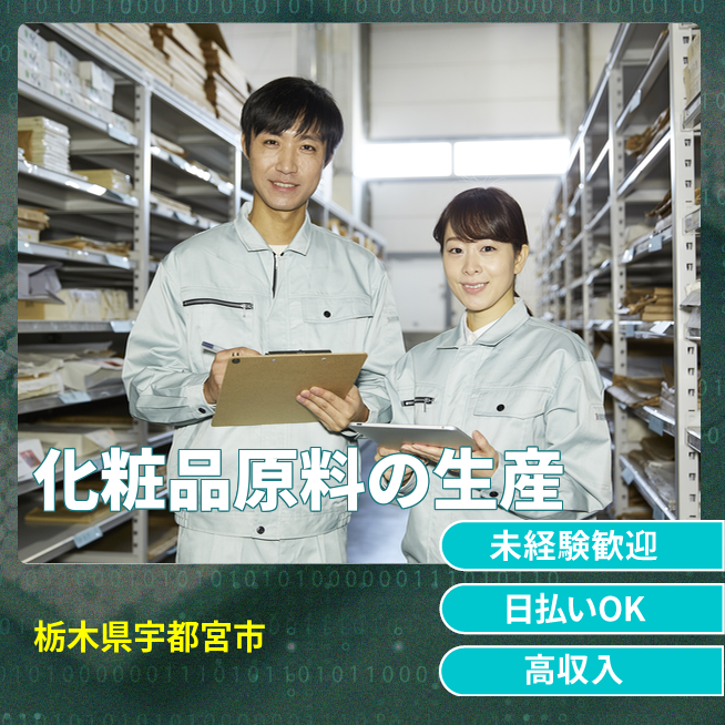 給与詳細 月収例 255,000円 日給例 12,400円 勤務地 栃木県宇都宮市 仕事内容 【化粧品・医薬品等の原料生産(日勤)】