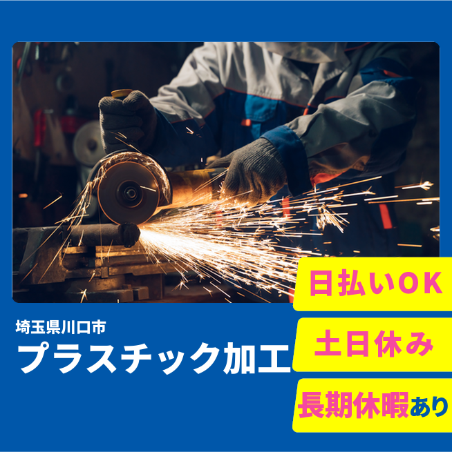 給与詳細 月収例 258,000円 日給例 12,400円 勤務地 埼玉県川口市 仕事内容 【プラスチック成型(日勤)】
