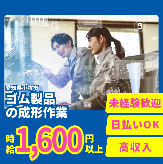 給与詳細 月収例 293,000円 時給例 1,600円 勤務地 愛知県小牧市 仕事内容 【自動車用ゴム製品の成形(3交替)】