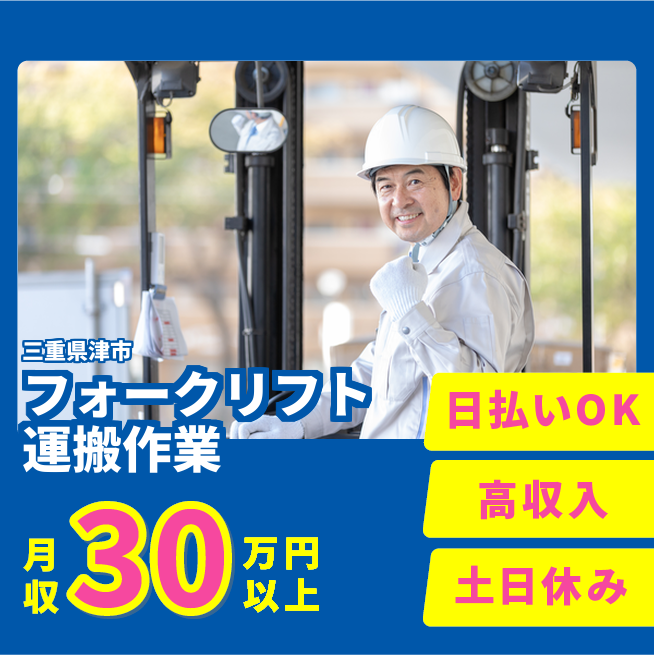 給与詳細 月収例 308,000円 時給例 1,600円 勤務地 三重県津市 仕事内容 【フォークリフトや運搬作業(2交替)】