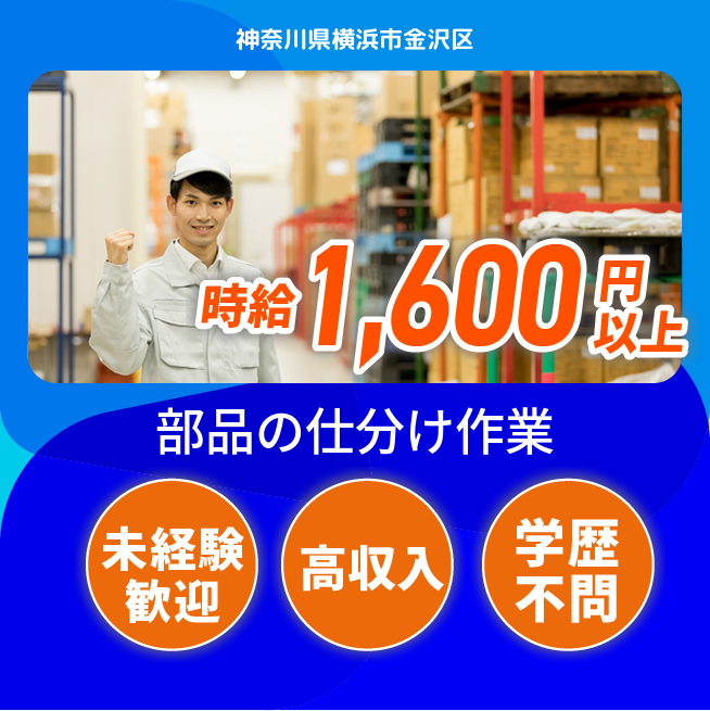給与詳細 月収例 177,000円 時給例 1,600円 勤務地 神奈川県横浜市金沢区 仕事内容 【部品の仕分け/軽作業(日勤)】