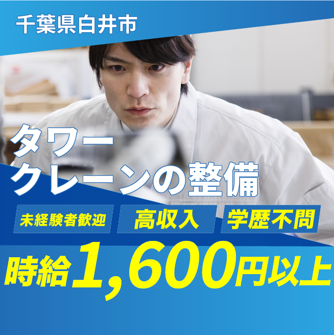 給与詳細 月収例 256,000円 時給例 1,600円 勤務地 千葉県白井市 仕事内容 【クレーンのメンテナンス(日勤)】