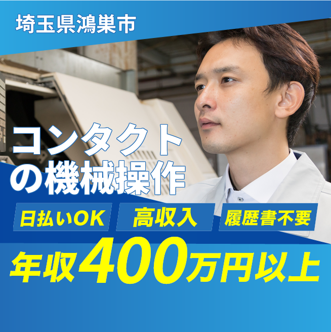 給与詳細 年収例 4,080,000円 月収例 340,000円 勤務地 埼玉県鴻巣市 仕事内容 【機械オペレーター・検査(2交替)】