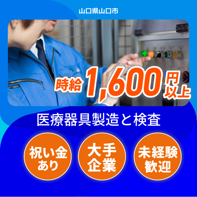 給与詳細 月収例 251,000円 時給例 1,600円 勤務地 山口県山口市 仕事内容 【医療器具の製造・検査(3交替)】