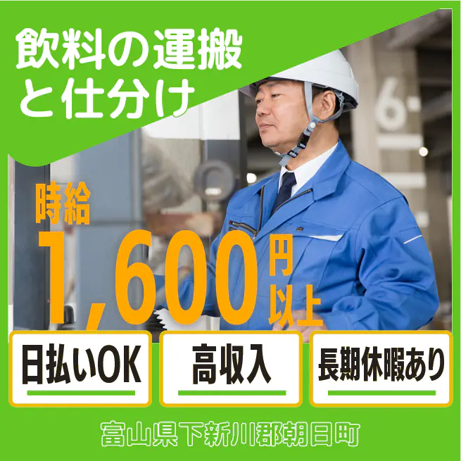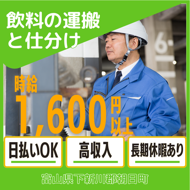 給与詳細 月収例 294,000円 時給例 1,600円 勤務地 富山県下新川郡朝日町 仕事内容 【運搬スタッフ/資格要(3交替)】