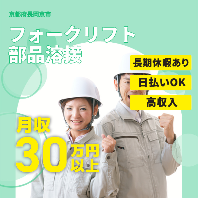 給与詳細 月収例 314,000円 時給例 1,700円 勤務地 京都府長岡京市 仕事内容 【溶接業務/要資格(日勤)】
