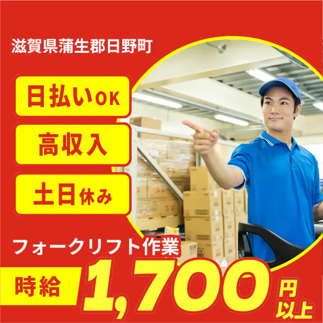給与詳細 月収例 284,000円 時給例 1,700円 勤務地 滋賀県蒲生郡日野町 仕事内容 【免許要/フォークリフト作業(日勤)】