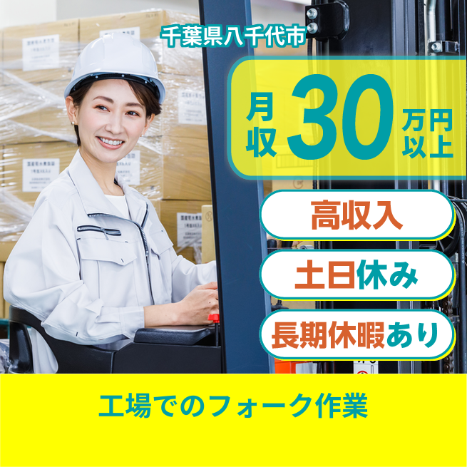 給与詳細 月収例 327,000円 時給例 1,700円 勤務地 千葉県八千代市 仕事内容 【フォークリフト・クレーン作業/要資格(日勤)】