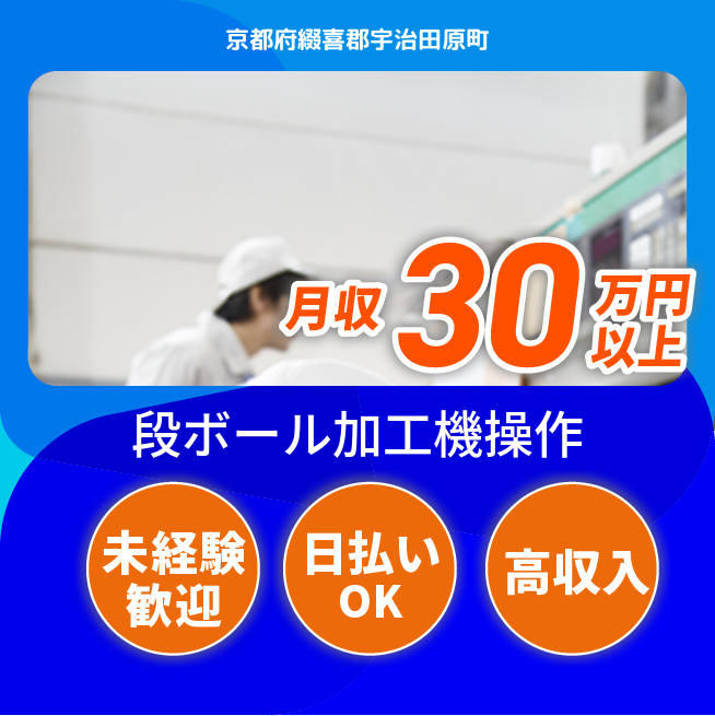 給与詳細 月収例 303,000円 時給例 1,700円 勤務地 京都府綴喜郡宇治田原町 仕事内容 【加工機のオペレーター(日勤)】