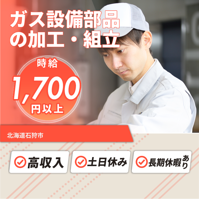 給与詳細 月収例 260,000円 時給例 1,700円 勤務地 北海道石狩市 仕事内容 【ガス供給設備部品の加工・組立(日勤)】