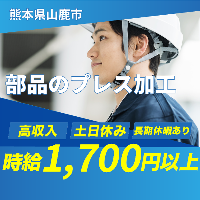 給与詳細 月収例 278,000円 時給例 1,700円 勤務地 熊本県山鹿市 仕事内容 【部品のプレス加工(2交替)】