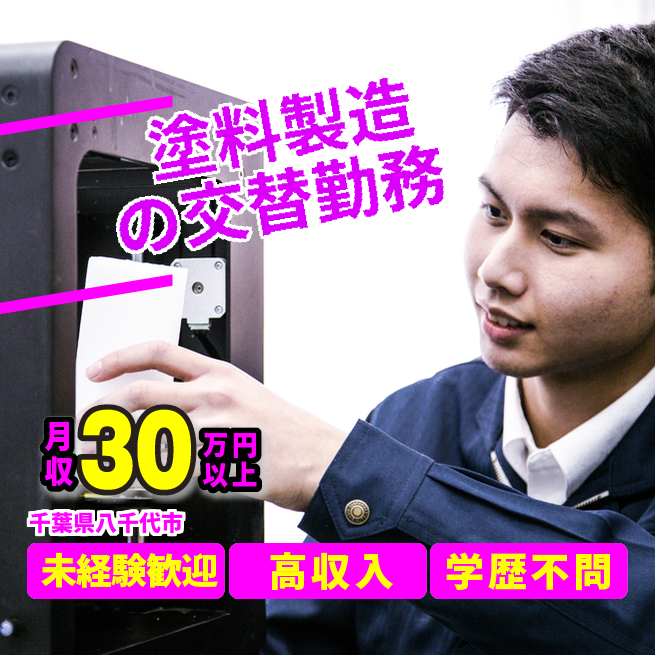 給与詳細 月収例 327,000円 時給例 1,700円 勤務地 千葉県八千代市 仕事内容 【塗料の製造スタッフ(3交替)】