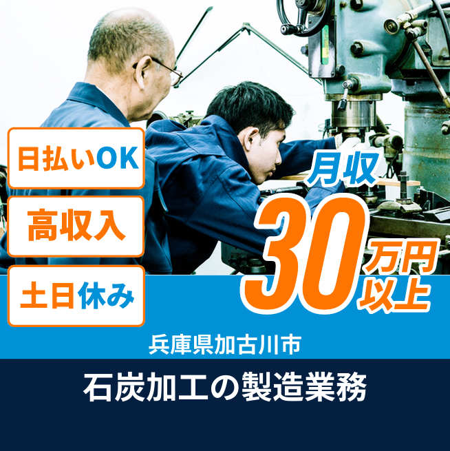 給与詳細 月収例 306,000円 時給例 1,700円 勤務地 兵庫県加古川市 仕事内容 【石炭加工スタッフ(日勤)】