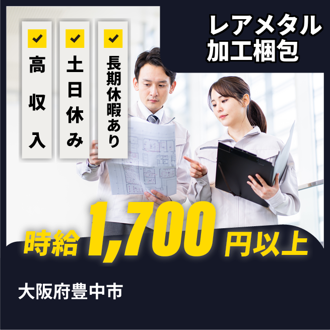 給与詳細 月収例 284,000円 時給例 1,700円 勤務地 大阪府豊中市 仕事内容 【製造補助作業/要資格(3交替)】