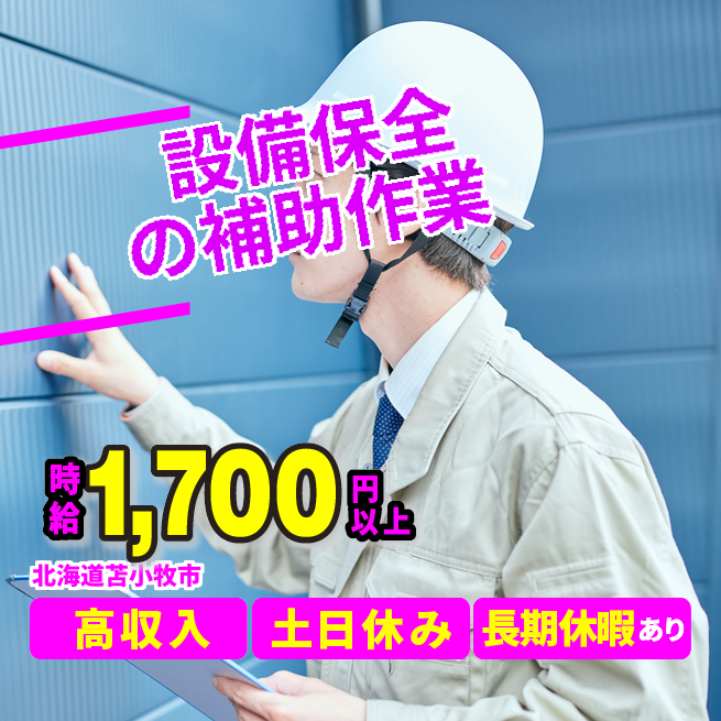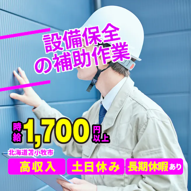 給与詳細 月収例 285,000円 時給例 1,750円 勤務地 北海道苫小牧市 仕事内容 【保全点検補助/要自動車免許(日勤)】