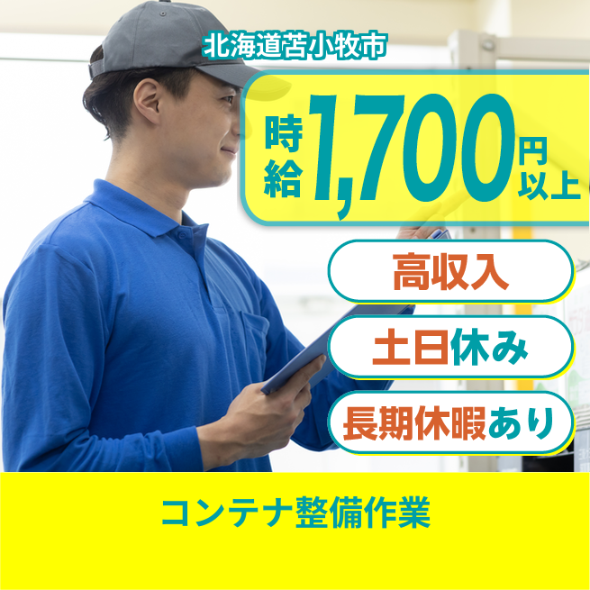 給与詳細 月収例 285,000円 時給例 1,750円 勤務地 北海道苫小牧市 仕事内容 【コンテナ整備/要自動車免許(日勤)】