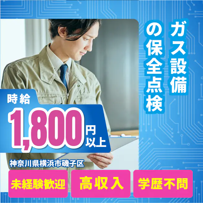 給与詳細 月収例 299,000円 時給例 1,800円 勤務地 神奈川県横浜市磯子区 仕事内容 【設備保全/ガス点検(3交替)】