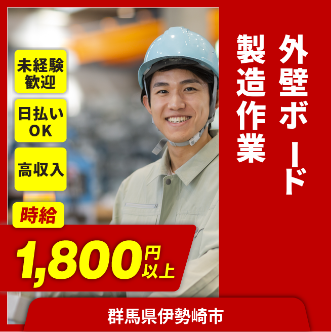 給与詳細 月収例 298,000円 時給例 1,800円 勤務地 群馬県伊勢崎市 仕事内容 【外壁ボードの製造オペレーター(3交替)】