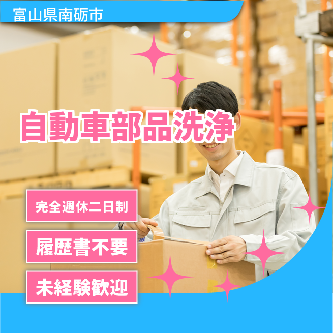 給与詳細 月収例 218,400円 時給例 1,120円 勤務地 富山県南砺市 仕事内容 社内で製作した金属製の自動車部品の洗浄作業を行って頂きます。立ち仕事で力作業です。
