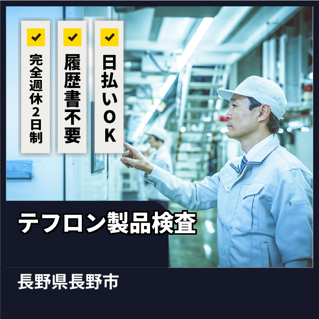 給与詳細 月収例 184,000円 時給例 1,200円 勤務地 長野県長野市 仕事内容 テフロン製品の検査