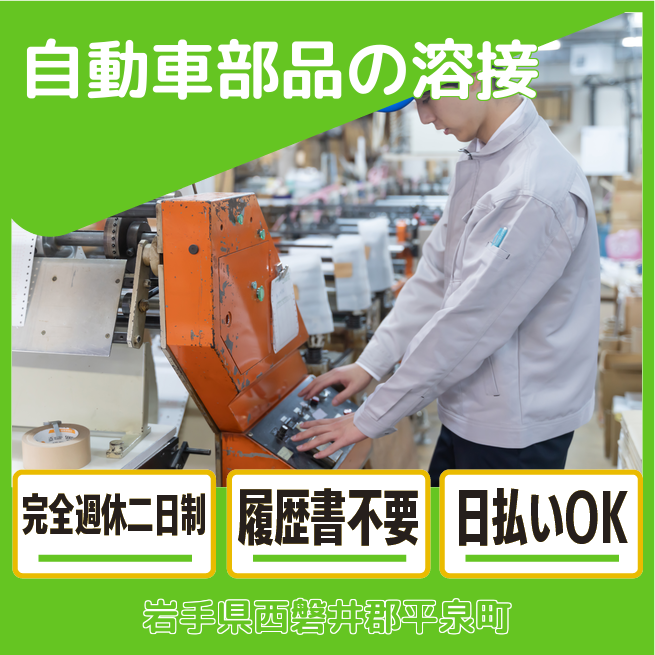 給与詳細 例 0円 時給例 1,500円 勤務地 岩手県西磐井郡平泉町 仕事内容 マフラー部品の溶接・組付け作業