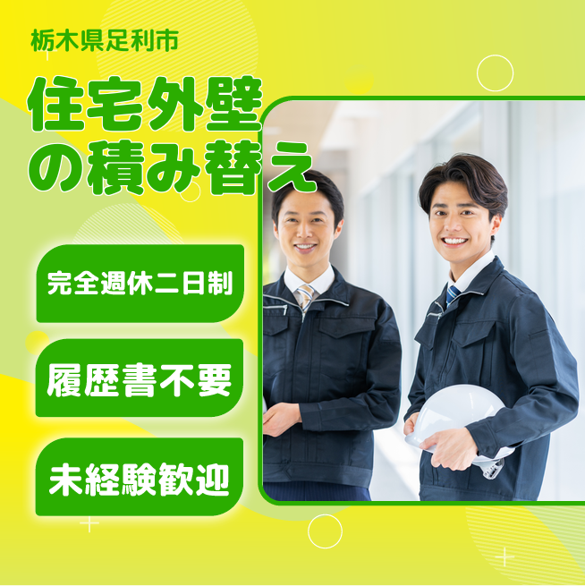 給与詳細 月収例 250,000円 日給例 12,500円 勤務地 栃木県足利市 仕事内容 住宅用の外壁等のパレットの積み替え、設備の清掃活動。